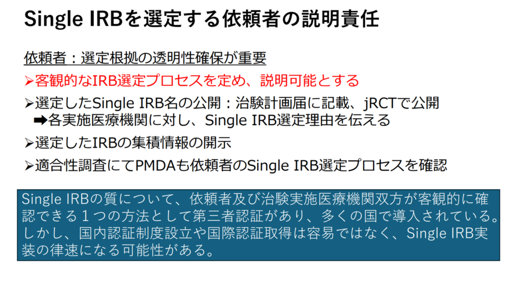 ここでこれからの課題になってくることは、各医療機関での倫理審査・試験実施体制の適切性を前提にしていたことが、治験依頼者(スポンサー)がIRBに直接審査依頼することで、治験依頼者(スポンサー)が倫理審査・試験実施体制の適切性をする必要があることです。